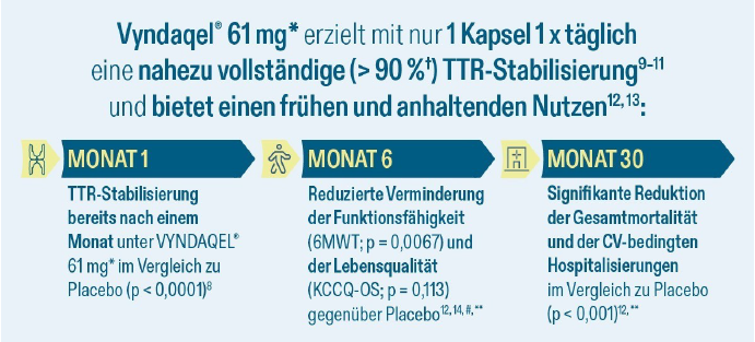 * Vyndaqel® (Tafamidis) 61 mg und Vyndaqel® (Tafamidis-Meglumin) 80 mg sind indiziert zur Behandlung der Wildtyp- oder hereditären Transthyretin-Amyloidose bei erwachsenen Patient:innen mit Kardiomyopathie.9 Eine einzelne Kapsel Vyndaqel® 61 mg ist bioäquivalent zu Vyndaqel® 80 mg (vier Kapseln zu 20 mg). Diese sind auf Basis der mg-Angabe nicht gegeneinander austauschbar.15