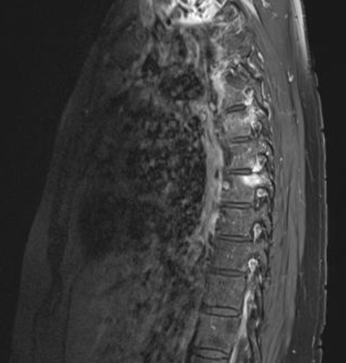 Zusätzlich klagte die Patientin über 7 schmerzende Gelenke (Tender Joint Count (TJC): 7). Die Schmerzen gab sie auf der Visuellen Analog Skala (VAS) mit 70 von 100 an. Besonders nachts waren die Rückenschmerzen quälend, während Bewegung tagsüber Linderung brachte. Die Blutsenkung lag bei 27 mm/h und der CRP-Wert bei 1,13 mg/dl. Rheumafaktor und CCP-AK waren nicht erhöht. Die Patientin war HLA-B27 negativ. Eine Untersuchung der Brustwirbelsäule im Februar 2020 zeigte eine Hyperämie am Kostotransversalgelenk und anteilig am Kostovertebralgelenk von BWK 7 links mit Ödem im angrenzenden Pedikel sowie diskrete Veränderungen auch an BWK 5 und eine diskale Enthesitis im Bereich BWK 5/6 rechts.