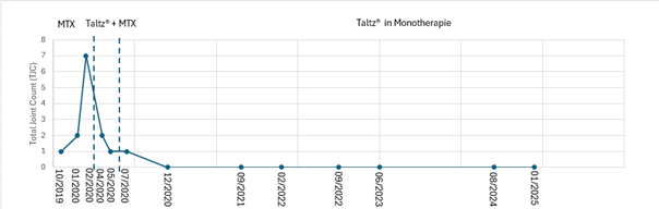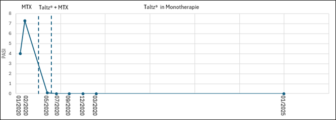 2019 stellte sich die damals 59 Jahre alte Patientin erstmals bei Dr. Christina Binder-Jovanović, Rheumatologin aus München, vor. Ein MRT ergab eine erosive Osteochondrose im Bereich LWK5/S1 mit einem Bandscheibenprolaps. Die Patientin äußerte den Wunsch eines Medikamentenwechsels, da sie durch die MTX-Therapie unter einer leichten Abgeschlagenheit und Kopfschmerzen litt sowie häufig an Infekten der oberen Luftwege und Harnwege erkrankte. Dr. Binder-Jovanović empfahl jedoch zunächst, die MTX-Therapie mit einer reduzierten Dosis von 10 mg wöchentlich oral weiterzuführen. Durch die Dosisreduktion kam es jedoch zu einem erneuten Schub: Anfang 2020 kehrte die Psoriasis in voller Stärke zurück: Ihr PASI (Psoriasis Area and Severity Index) stieg von 4,0 im Januar auf 7,2 im Februar stark an. Auch der Genitalbereich war betroffen.