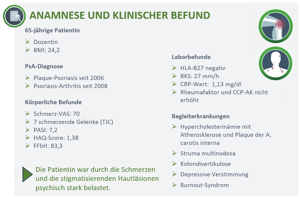 Bei der Dozentin bestand bereits seit 2006 eine Plaque-Psoriasis mit hartnäckigen Läsionen an Stamm, Armen und Beinen. Beim Dermatologen hatte sie dagegen regelmäßig eine PUVA-Therapie erhalten. 2008 waren Gelenkschmerzen hinzugekommen, die vor allem Zehen, Finger und Handgelenke betrafen. Die Patientin fühlte sich dadurch in ihrem Beruf stark eingeschränkt, weshalb sie sich in einer rheumatologischen Praxis vorstellte. Dort bekam sie die Diagnose einer Psoriasis-Arthritis und man stellte sie auf Methotrexat (MTX; 15 mg/Woche) ein, zunächst subkutan, später oral. Zudem litt sie an depressiven Verstimmungen und einem Burnout-Syndrom, weshalb sie zeitweise arbeitsunfähig war und im weiteren Verlauf in Frührente ging. Besonders die sichtbaren, stigmatisierenden Hautläsionen belasteten die Patientin psychisch sehr.